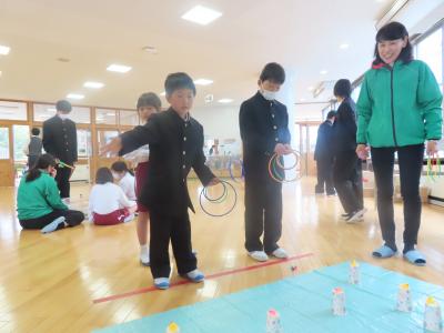 5月8日のお昼休み、避難所の炊き出しに来ていただいた日本食育HEDカレッジの皆様、NHKプロモーションのイベント事業の皆様のご支援で楽しいイベントが開かれました。簡単そうに思えた輪投げも意外と難しく、成功した時は喜びの歓声が響き渡りました。また、お菓子釣りでは、ねらったお菓子を釣るのに真剣な様子が見られました。とても楽しいひとときを過ごすことができました。