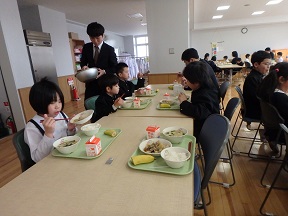 新しい縦割り班での初めての活動は、給食の盛り付けでした!