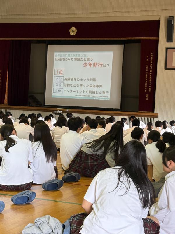 警察署の方、石川県教育委員会の方よりそれぞれ、非行の実態やその結果など実際に起こった事案も交えた話をしていただきました。