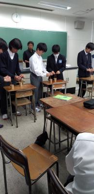 講義では、簡単な工作で真空装置をつくり、そのなかの水が手のひらの熱で沸とうすることを体験しました。