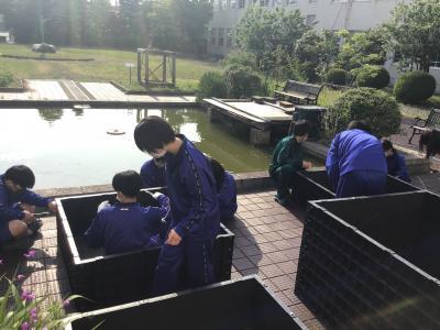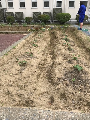 5月16日(金)、1学期中間試験が終わり、園芸部は中庭にサツマイモ(五郎島金時)と