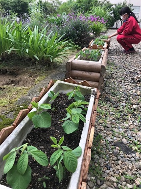 園芸部の花壇ではじゃがいもが元気に芽を出しました。