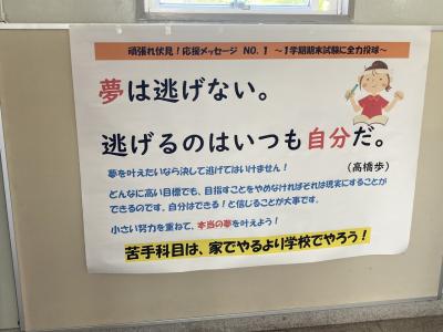 明日は考査最終日。熱中症対策をしながら、努力の成果や実力を発揮できるよう頑張りましょう。応援しています。