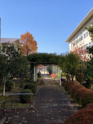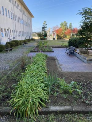 園芸部の畑と花壇 手入れが綺麗にされています 噴水のBackも紅葉した木々