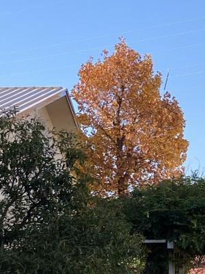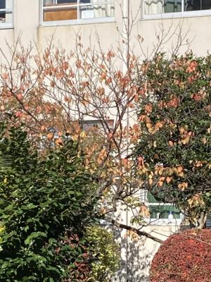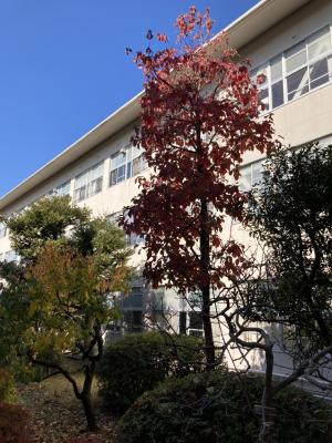 秋の高く晴れた空にそびえる体育館横の大木。紅葉が美しいですね。丸く可愛くカットされた低木も色づいてます。
