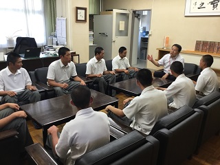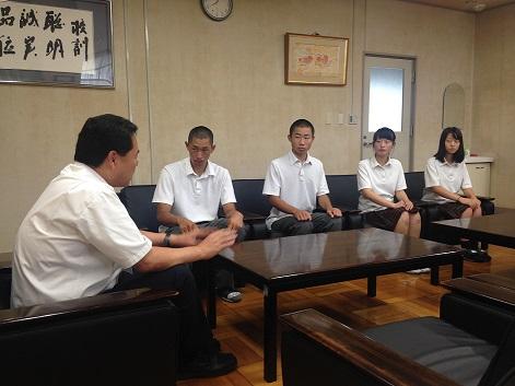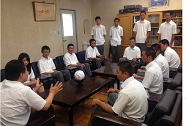 東日本大震災の被災地支援事業として、8月1日から3日まで福島県を訪問しました。部員たちは訪問先の高校と交流試合をしたほか、福島第一原発の事故や津波の被害に遭った地域を見学しました。本校に戻ってから、校長先生に被災地で学んだことを報告しました。