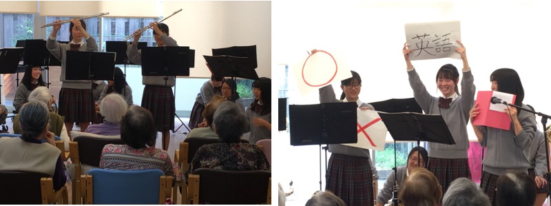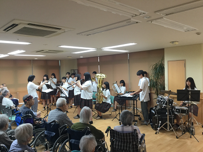 9月16日の敬老の日に、私たちは、西泉の特別養護老人ホームゆうけあ相河で慰問演奏をしました。「さくらさくら」、「赤とんぼ」などを演奏し、最後に全員で演奏に合わせて「ふるさと」を歌いました。皆さん曲に合わせて手拍子をしてくださったり曲に合わせて歌ったりと楽しい時間を過ごすことができました。