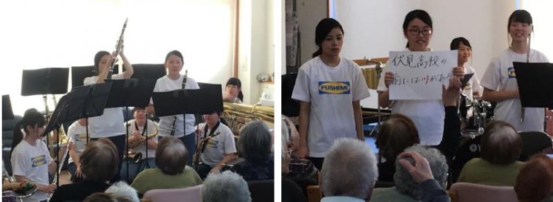 11月5日(月) 金沢市横川3丁目の「リハビリデイサービスまごころ倶楽部」で演奏をしました。「ヤングマン」「赤とんぼ」「さくら」「荒城の月」「富士の山」など、お年寄りの皆さんになじみ深い曲を中心に、途中、楽器紹介や、伏見高校〇×クイズなどで、皆さんとの交流をさせていただき、最後に「ふるさと」を皆さんで合唱しました。