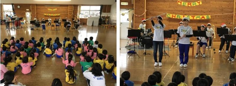12月28日(金)、伏見かわい幼稚園にて、演奏会を行いました。「ちびまるこちゃんのテーマ」、「サザエさんメドレー」、「ミッキーマウスマーチ」、「夢をかなえてドラえもん」など、よく知っている曲を中心に演奏しました。みんなでクイズを楽しんだり、一緒に曲に合わせて踊ったり、演奏と交流で楽しいひと時を過ごすことができ、部員たちにとって貴重な体験となりました。ありがとうございました。
