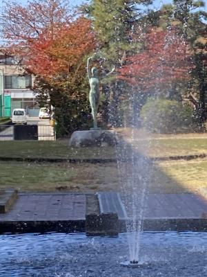 園芸部の畑と花壇 手入れが綺麗にされています 噴水のBackも紅葉した木々