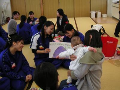 はじめは赤ちゃんが泣いてしまったり、なかなかうまくだっこできなかった生徒もお母さんのお話を伺ったり、おもちゃを使ったりしているうちに上手くだっこできるようになり時間があっという間にたちました。生徒が作った紙芝居をじっと見てくれるこどもたちに感動していました。