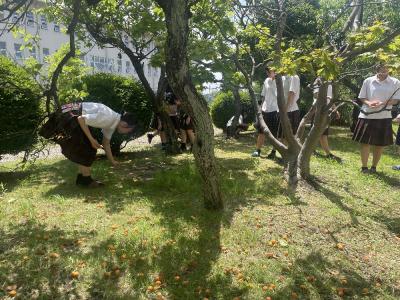本日雨上がりの中庭で、校風委員が梅を収穫しました。伏見高校には噴水や池もある素敵な中庭があり、そこに記念樹として梅の木も何本か植えられています。あじさいも見ごろを迎えています。伏見高校の校章にもなっている伏見の「梅」をなんとか有効活用できないかと考えています。梅シロップや梅ジャムを使ったお菓子など、伏見高校で採れた梅を使って、みんなを笑顔にしたいです!!