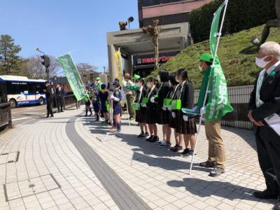 令和3年4月1日(木)、桜満開の快晴の中、令和3年度緑の募金出発式へ参加させて頂きました。出発式では、JRC部部長の里谷はずきさんが代表者として受け取り、その後、街頭募金活動を行いました。昨年度はコロナの影響で活動できませんでしたが、久しぶりに生徒の笑顔がこぼれ、校内では経験できない貴重な体験をすることができました。