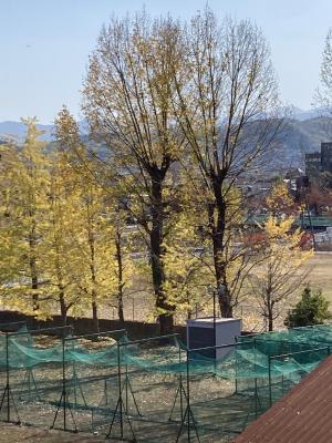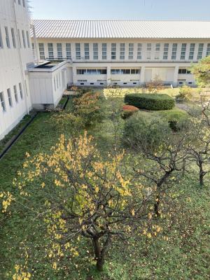 秋の高く晴れた空にそびえる体育館横の大木。紅葉が美しいですね。丸く可愛くカットされた低木も色づいてます。