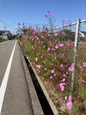 外へ出ると、校舎周辺のフェンスわきには秋桜が満開でした。