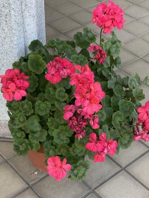野球部練習場 生徒玄関前には華やかな花「ゼラニウム」