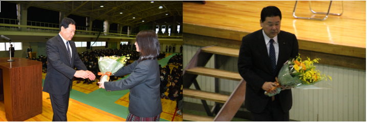 本日、3学期の受賞報告会・球技大会表彰式・終業式に続いて平成30年度の離任式・退任式が行われました。本年度は校長先生を含め11名の方が伏見高校を去られることになりました。在校生や駆けつけてくれた卒業生たち・保護者の方に見守られ、壇上のお一人一人から心のこもったパフォーマンスやお別れの言葉があり、会場の体育館は終始和やかな雰囲気に包まれていました。