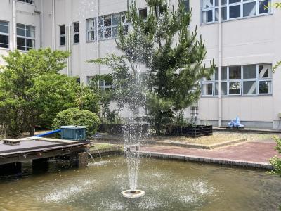 園芸部の農作物も順調に育っています 池の噴水と青空