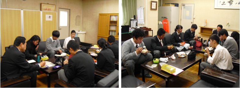 本日、校長室で1年生のクラス会長と校長先生との昼食会が行われました。自己紹介の後、会長としての抱負や中学校と高校との違い、伏見高校の魅力などについて語り合いながら、楽しいひとときを過ごすことができました。