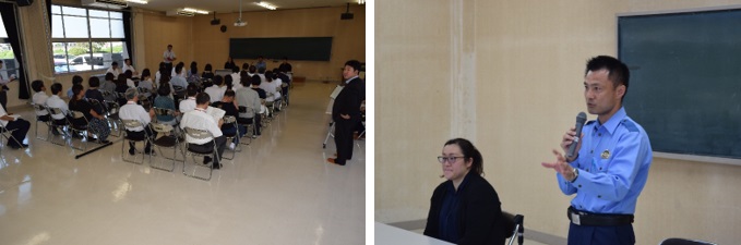 5月18日(金)、1学期中間考査終了後、防犯教室を開催しました。金沢中警察署員2名の方を講師に、自転車の盗難にあわないようにするための注意事項、ストーカー行為やDVの石川県の現状についてお話しをいただきました。そして不意に襲われた場合の対処方法を体験するなど、生徒たちは真剣に話を聴き、取り組んでいました。登下校時だけではなく、SNSを通じてなど身近なところでトラブルが起きている現実を知ることで毎日の何気ない行動にも注意が必要だということを改めて学ぶことができました。