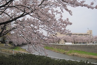 | ふと見上げると、頭上は満開の桜。本校前を流れる伏見川沿いは桜の名所でもあります。 | ||