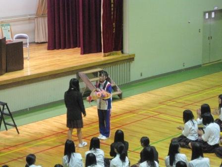 校長先生から優勝をたたえていただくとともに、3月の全日本ジュニア(新潟県)でも優勝目指してがんばってほしいとの激励の言葉をいただきました。