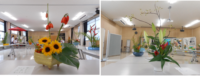 9月1日の清流祭2日目。学校を開放してクラス企画のお化け屋敷や迷路、宝探し、焼きそばや唐揚げ、ベビーカステラやポテトなどの模擬店や、有志のステージ発表がありました。華道部も日ごろの成果を見ていただくために、それぞれが自分の好きな花を選び、思い思いに生けて展示しました。普段のお稽古では使わないような華やかな花や珍しい花が色々あり、いつもとは違った作品に仕上げることができました。たくさんの方に見に来ていただいたことに感謝しています。