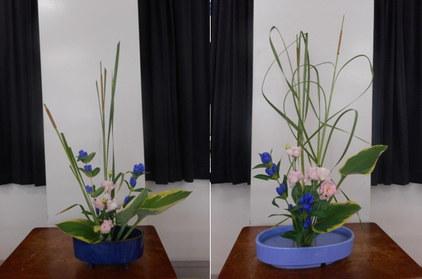 今日のお花はガマの穂、竜胆、トルコ桔梗、ギボシです。ガマの穂の扱いが難しく四苦八苦しました。短く切って穂の高さと合わせる生け方と長いまま輪にする生け方とを教えていただきました。各自の好みで生け、それぞれにさわやかな作品が完成しました。(2018/6/20)