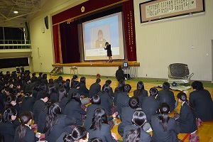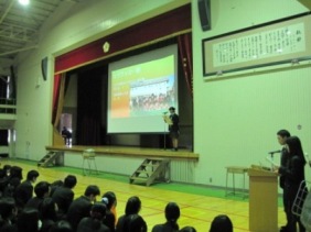 生徒会執行部の司会・進行により、受賞代表者が全校生徒に報告しました。