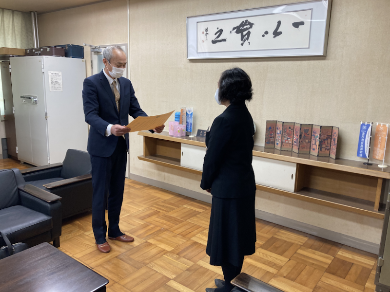 瀬川さんのお母様が今年1月に路上で転倒した際、通学途中の本校生徒6名が救急車を呼び、迅速な対応で救助したことに対するお礼を伝えたいと来校されました。