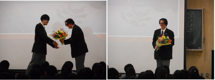 1月29日、留学生のジョシュアさんが帰国を前に、同級生である2年生の前で日本語でのスピーチを披露しました。オーストラリアの様々な文化をクイズ形式のパワーポイントで流暢な日本語で話し、正解者にはオーストラリアのお菓子をくれるなどのお楽しみも用意してあり、生徒たちはジョシュアさんとの最後のひとときを楽しみました。最後にみんなを代表してジョシュアさんが在籍していた26Hのホーム委員長から感謝の花束が贈られました。