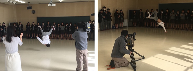 来年1月5日(金)にテレビ金沢の「となりのテレ金ちゃん」で金森翔也君(1年生)のブレークダンスが放映されます。本日、その撮影が伏見高校で行われました。ユース五輪を目指す金森君の迫力ある動きをテレビでご覧ください。