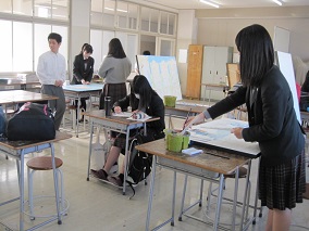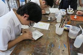 | 美術室は管理棟2階にあります。 | 一人ひとりが出品作品に向かっています。 とても和やかな雰囲気です。 | |