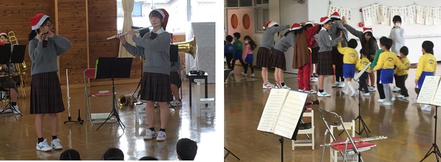 12月28日(金)、伏見かわい幼稚園にて、演奏会を行いました。「ちびまるこちゃんのテーマ」、「サザエさんメドレー」、「ミッキーマウスマーチ」、「夢をかなえてドラえもん」など、よく知っている曲を中心に演奏しました。みんなでクイズを楽しんだり、一緒に曲に合わせて踊ったり、演奏と交流で楽しいひと時を過ごすことができ、部員たちにとって貴重な体験となりました。ありがとうございました。