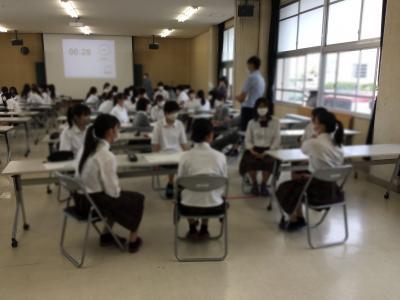 生徒たちは真剣に聞き、プリントにまとめていました。
