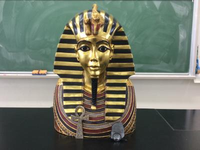 古代エジプトといえば「ツタンカーメンの黄金のマスク」が有名です。生徒たちは実物大のマスクを興味津々に観察し、「アイラインをしてる!」「鼻筋がキレイ」と感想を言っていました。