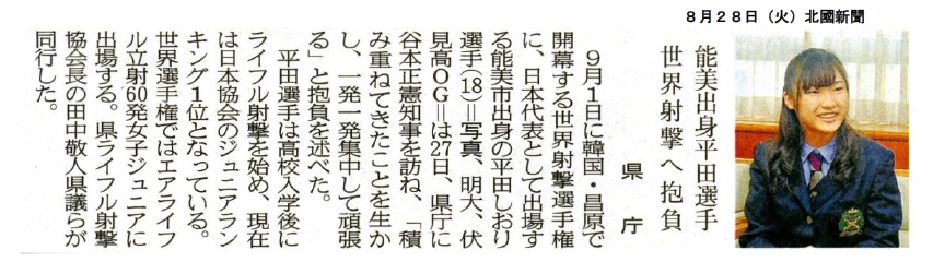 本校OG平田しおりさん 世界射撃出場! 投稿日時 : 2018/08/28 hushih 本校卒業生の平田しおりさん(明治大学1年)が9月1日から韓国で開催される世界射撃選手権に日本代表として出場することになり、このほど県庁へ谷本正憲知事を訪ね、大会での健闘を誓いました。平田さんの素晴らしいご活躍を全校あげて応援しております。