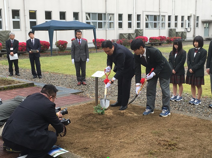 第66回全国植樹祭(平成27年:小松市で開催)で天皇陛下がお手播きされた種から育ったアテの苗木を徳田校長と生徒会長が校庭に植樹しました。その後、6人の生徒会役員が順に水やりをしました。