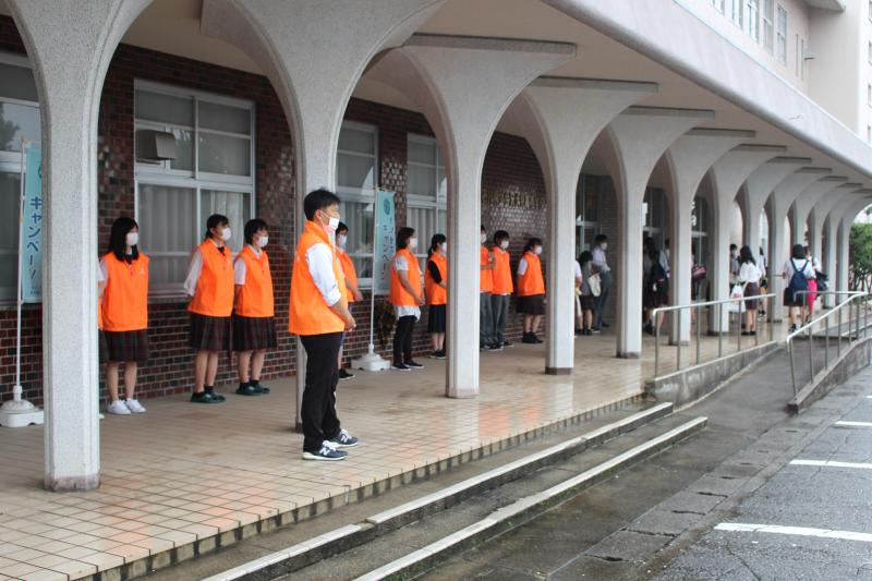 9月は「心の教育推進協議会」によるグッドマナーキャンペンーの取り組み月間となっています。このほど石川県高等学校PTA連合会より「令和2年度 第2回自転車乗車マナー一斉指導」の協力依頼があり、本校のPTA・生徒会「あいさつ運動」を9月23日(水)から25日(金)の3日間実施しました。今年度は、石川県教育委員会より示された新型コロナ感染症予防対策の指針を踏まえた活動となりました。マスク越しでお互いの表情がわかりにくかったものの、爽やかな挨拶が交わされ、すがすがしい気持ちになれた「あいさつ運動」でした。