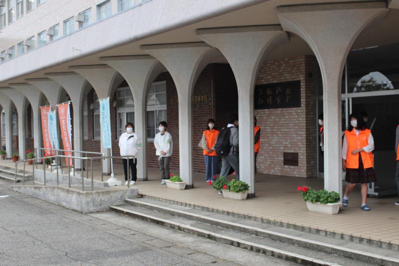 21日(水)は、先週の暑さが嘘のように涼しくなった小雨の中で実施されました。21日は、自転車乗車マナー一斉指導の実施日ということもあり、校門に加えて三歳橋付近と西泉3丁目交差点の3カ所で行いました。