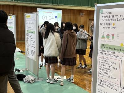 10月に「フィールドスタディ」として地域の企業を訪問させていただき、企業が抱える課題やその解決に向けた取組を学ばせていただいたきました。その経験を踏まえて、地域や社会の課題とその解決方法についてグループごとに探究してきた成果を発表しました。