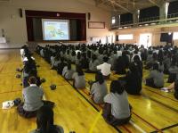 に教室から避難経路を通り、体育館に集合しました。そして、体育館で