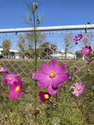 外へ出ると、校舎周辺のフェンスわきには秋桜が満開でした。