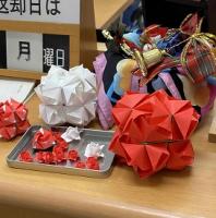 ボックスローズは見た目が華やかなので、クリスマスの飾りにぴったり。図書館にもみんなが作ってくれたボックスローズを展示しています。