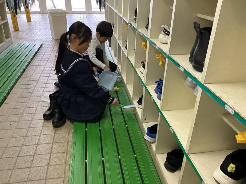 12月22日(月) 寒い朝に玄関からかわいい声が聞こえてきました。自分の下足箱を掃除していた1年生でした。