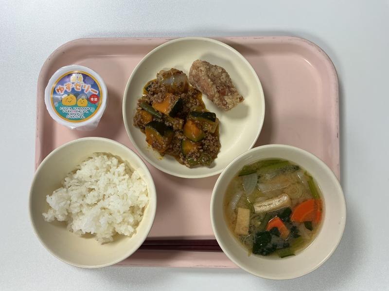 白ご飯、唐揚げ、、カボチャのそぼろ餡、味噌汁、ゆずゼリー、牛乳