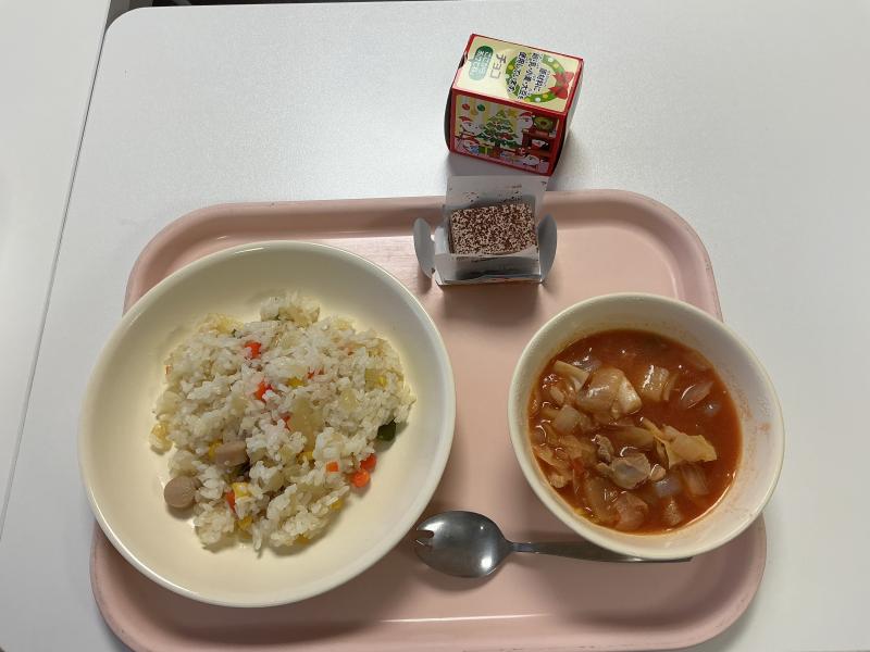 ピラフ、トマトスープ煮、クリスマスケーキ、牛乳
