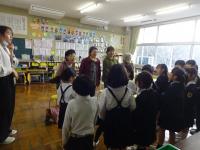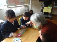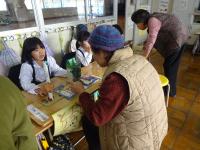一年生は、「こっちきてください」「こうやって遊びます」ととっても積極的です。お年寄りの皆さんも始終笑顔で、一年生の説明に、にこにことうなずいてくださいました。みんなのお店を一回りして、最後は歌を歌ってお別れしました。