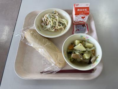 6/12の給食は、コッペパン、スパゲッティサラダ、野菜たっぷりポトフでした。