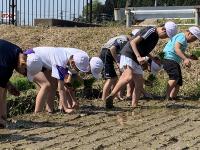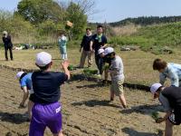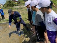 5月1日(月)5年生が米作り体験の一環で田植えの体験をしました。飯田町で唯一の田んぼに、「きた会」さんのお世話で、苗を植える体験をさせていただきました。田植えは初めての児童がほとんどでしたが、植えた後の田を見ると、揃って真っ直ぐに植えられていました。びっくりしました。丁寧な仕事をする5年生の良さが現れているようでした。腰をかがめて田植えをしてみて、米作りの苦労が少しでも感じられたでしょうか。今日のご飯を、いつも以上に感謝していただけるといいですね。